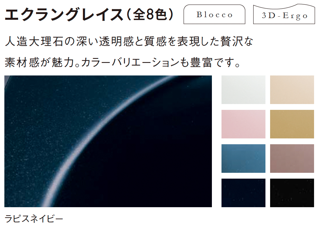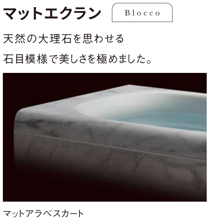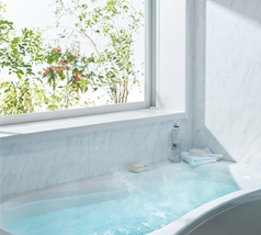 肌に触れるものだからこそ、その触れ心地にはこだわりたいもの。トクラス独自の人造大理石素材「エクラン」は深みのある宝石のような輝きとしっとりとした肌触りで、入浴の心地よさが続きます。