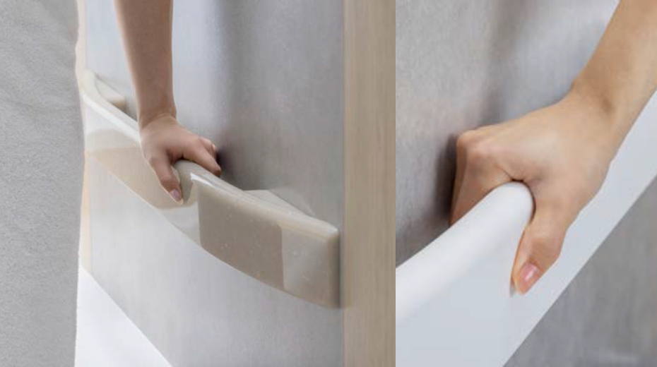 機能性と美しさを備えた握りバー浴槽から洗い場まで伝い歩きができる長さ、位置に設置。しっかりとした厚みと握りやすい工夫で体重を支えます。裏面には滑りにくい加工を施しています。