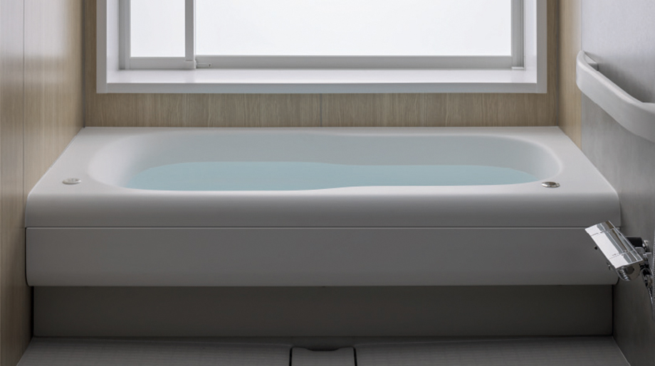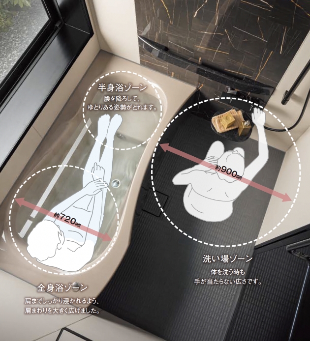 バスタブにゆっくり浸かる、洗い場でのびのびとラクに身体を洗う。人間工学に基づいたバスタブのゆるやかな曲線が、浴室空間の広さと使い勝手のよさを実現させました。