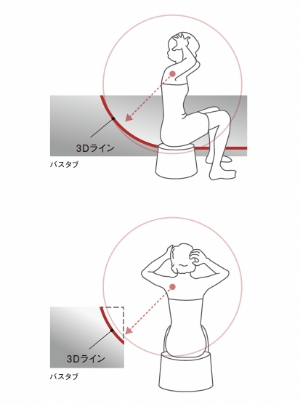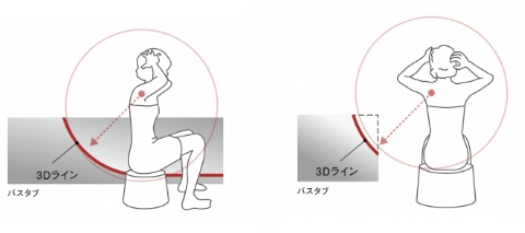 洗い場での人の動きから導き出された3Dライン。バスタブを切り取ったような形は洗い場で腕や手があたらないように考えられたデザインです。