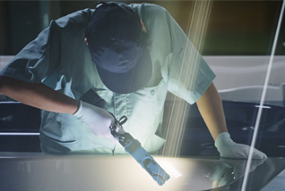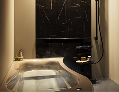一日の疲れを落とす浴室で、くつろぎの舞台となるのはバスタブ。直接肌に触れる部分だからこそ、肌ざわりのなめらかさを大切にしています。バスタブ専用に開発をおこなっている独自の素材です。