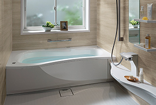 バスタブも洗い場も、ひろびろ使いたい。人間工学を基本に人と浴室の関係を追求して生まれたエルゴデザイン。計算された曲線のバスルーム形状で、入浴のときも体を洗うときもゆったりひろびろと使えます。
