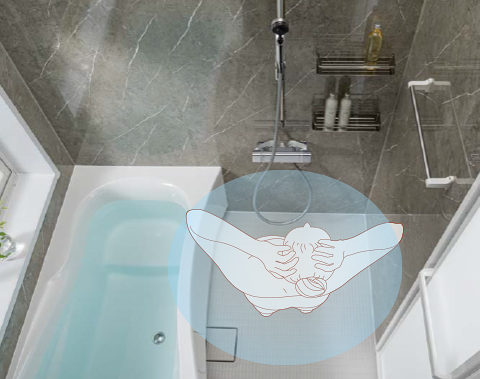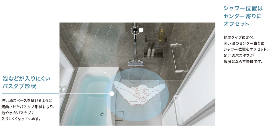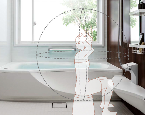 バスタブにゆっくり浸かる、洗い場でのびのびと身体を洗う。人間工学に基づいたバスタブのゆるやかな曲線が、浴室空間の広さと使いやすさを実現させました。