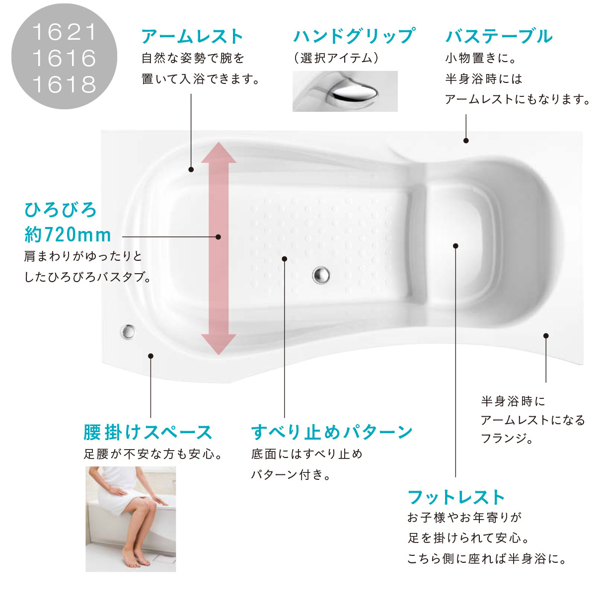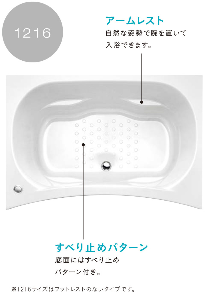 シャワー空間を妨げない湾曲した形状のバスタブです。