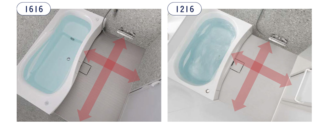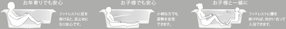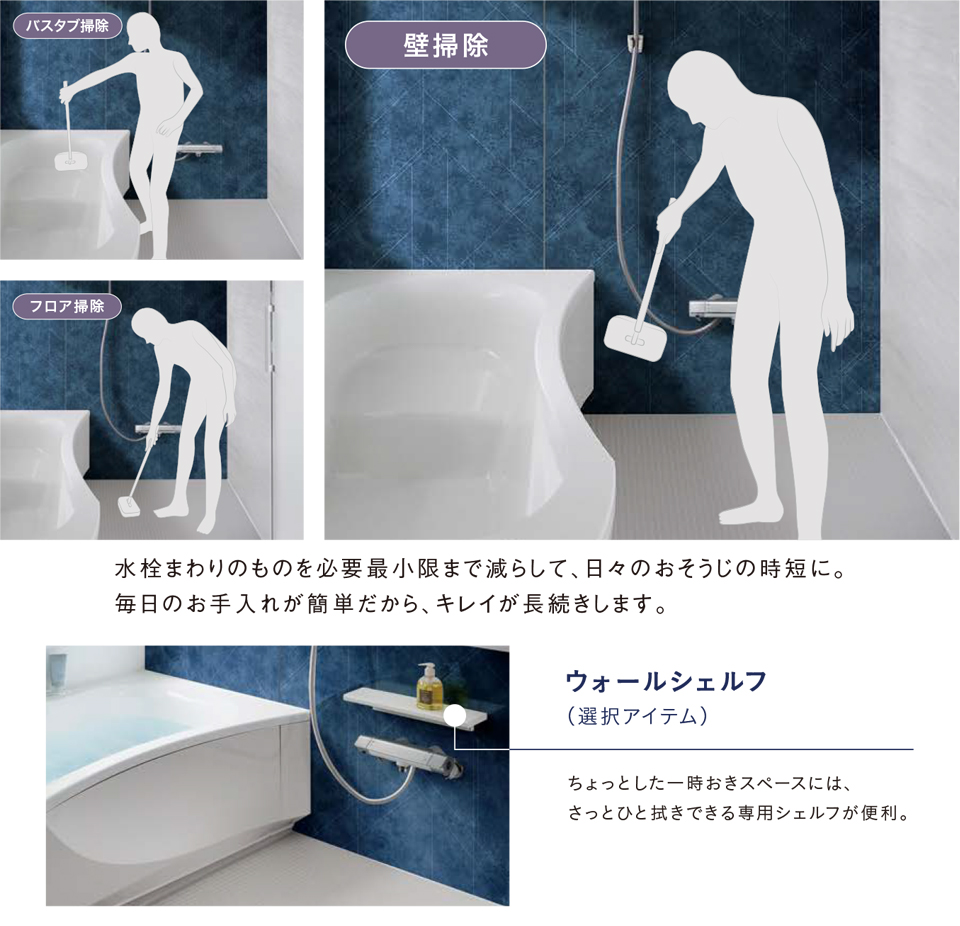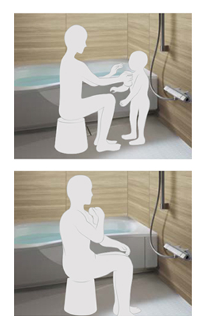 ミニマルタイプなら、どんなサイズのお風呂でも洗い場が広く使えて、 動作にゆとりが生まれます。お子様と入るときも、一人で入るときも、 ぶつかるカウンターがないので安心。
