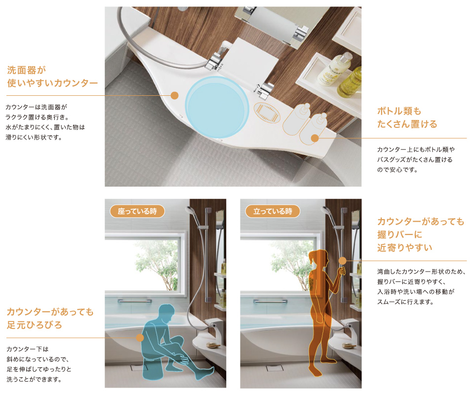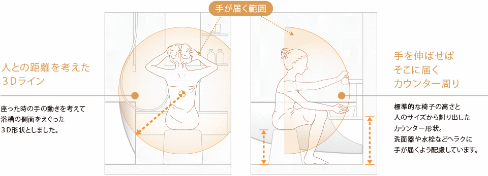座った時に使いやすいバスタブ形状とカウンターの設計