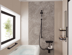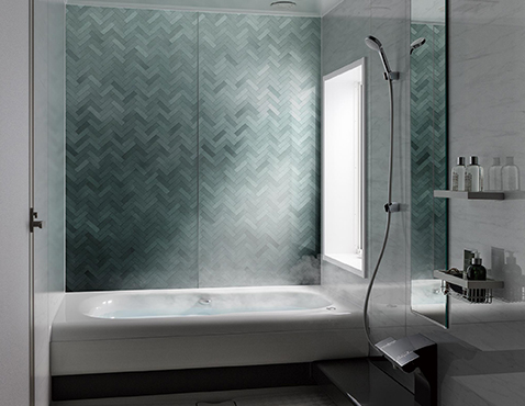 新提案のシンメトリーデザインの壁面により、視覚から入浴時の開放感を実現しました。シンプルでありながら個性的な空間を演出します。
