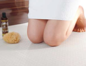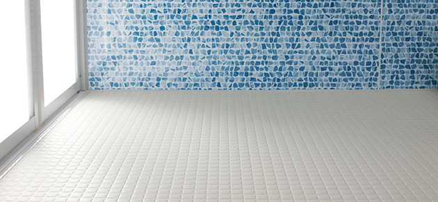 クッション性と保温効果のある浴室床。足裏にやわらかく、冷えにくく、ヒザやおしりをついて座っても痛くない。リビングのような心地よさが生まれます。