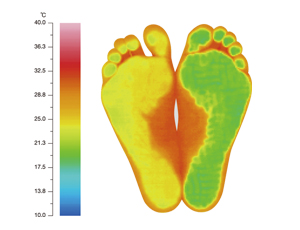 【図は、表面温度5℃の床材に15秒立った足の裏のサーモグラフ。従来品(右)と、やわらぐフロア(左)で約5℃の違いがあります。】