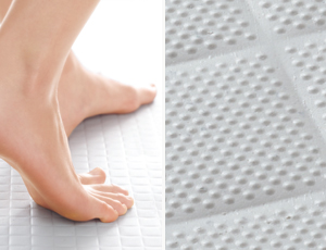 床材の表面は特殊エンボス加工になっており、微細な凹凸が足裏にしっかりフィット。水に濡れてもすべりにくいフロアです。