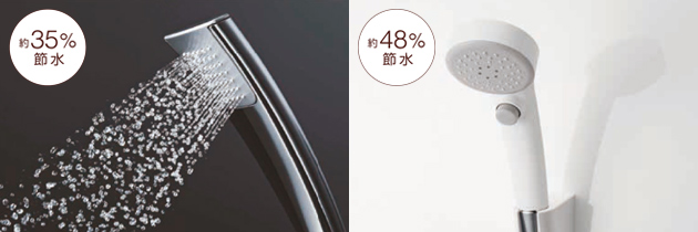 空気を含んだ大きな水滴の「エアインシャワー」や、手元スイッチでシャワーの出し止めを簡単に操作できる「エアインクリックシャワー」などを選択することで、節水できます。