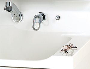ボウルの両サイドに仮置きスペースを一段高く設定。小物などを濡らさずに置けます。