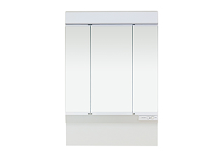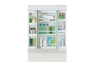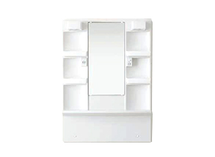 中央の鏡はくもり止め加工を施しているので、くもりにくく快適です。化粧品専用トレーやスライドトレー、コンセント付き。