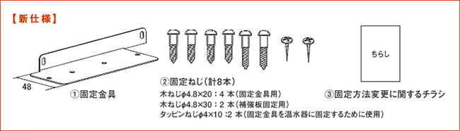 ■2013年3月21日以降出荷製品(【新仕様】)には、①固定金具②固定ねじ(計8本)③固定方法変更に関するチラシが同梱されています。 【新仕様】の固定金具と固定ねじを用いて、適切に固定してください。