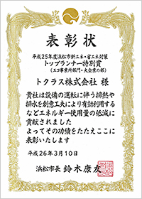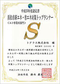 トクラス株式会社は、浜松市より「平成25年度浜松市新エネ・省エネ対策トップランナー認定制度(※)」の「エコ事業所部門」において、最上位のSクラス認定を受けるとともに、審査員特別賞を受賞いたしました。