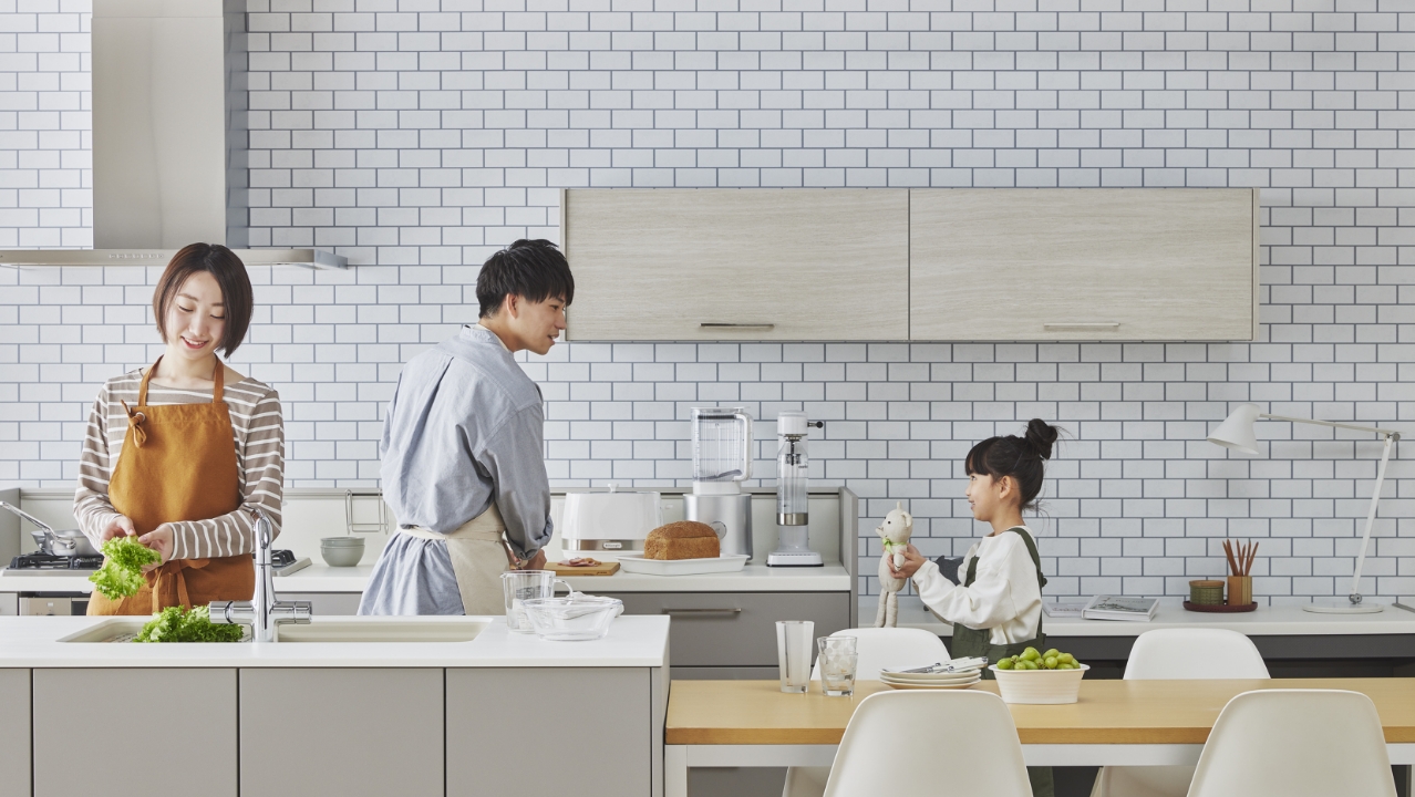 家族みんながひろびろ使える2列型キッチンで、好奇心いっぱいのお子さんも、目を輝かせてジュース作りのお手伝い。