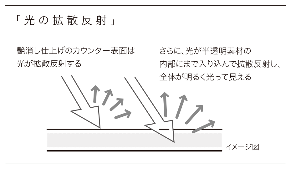 なめらかな手なじみ感と、奥行きのある美しい色合いが自慢の「グラーナ」。カウンターの素材自体が半透明なので、光が表面と内部で拡散反射し、内側から淡く発光しているかのような明るさを感じさせます。