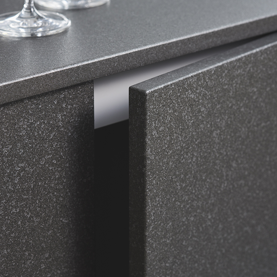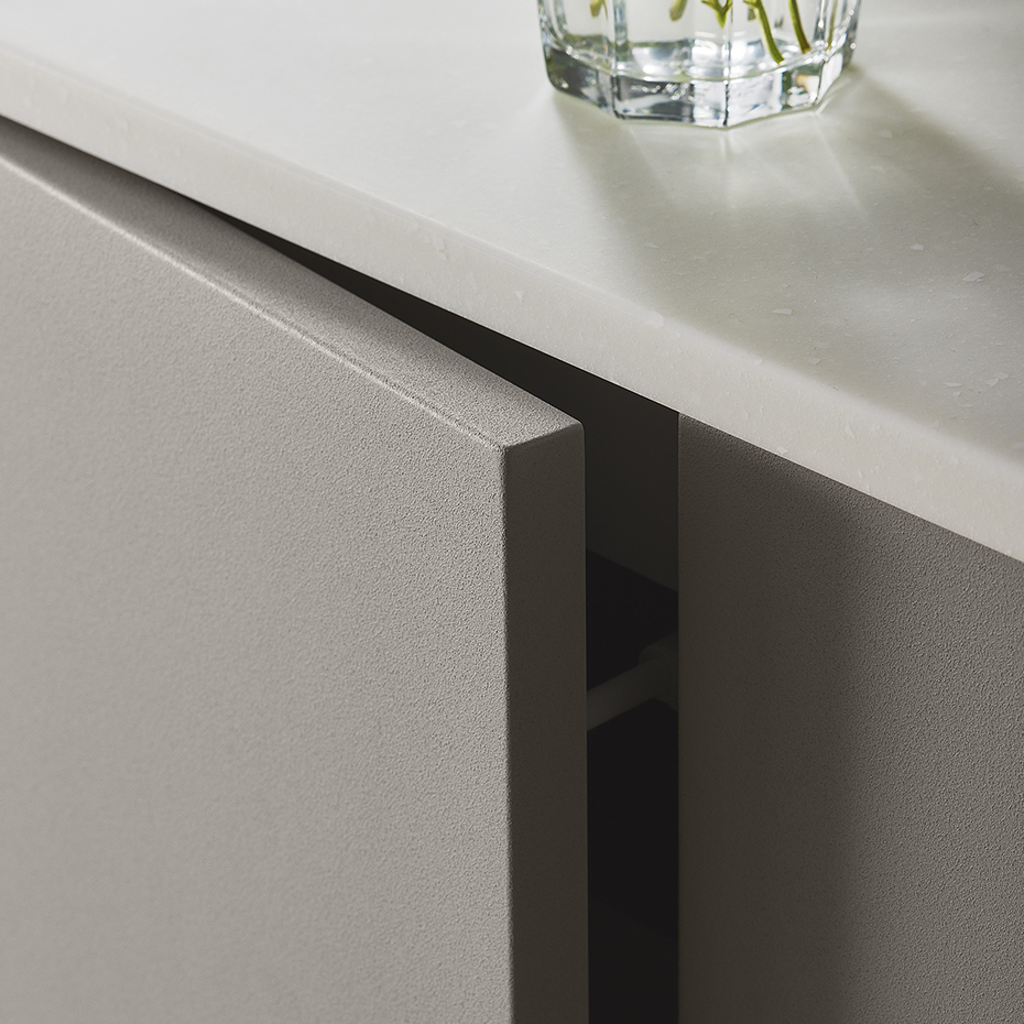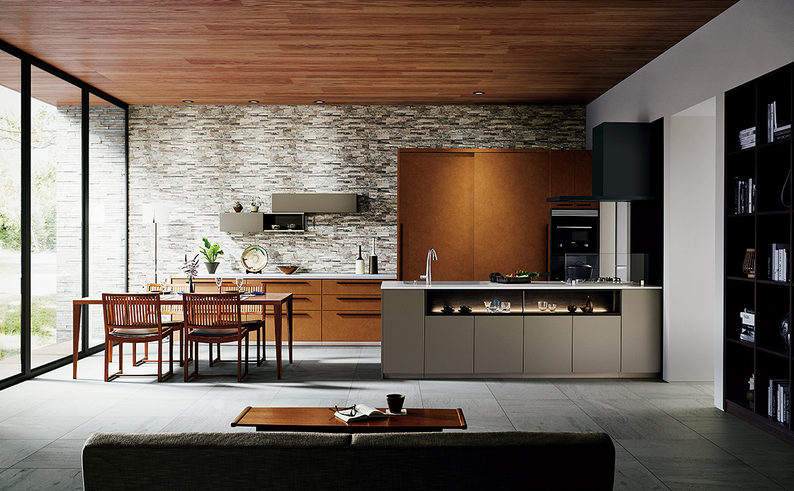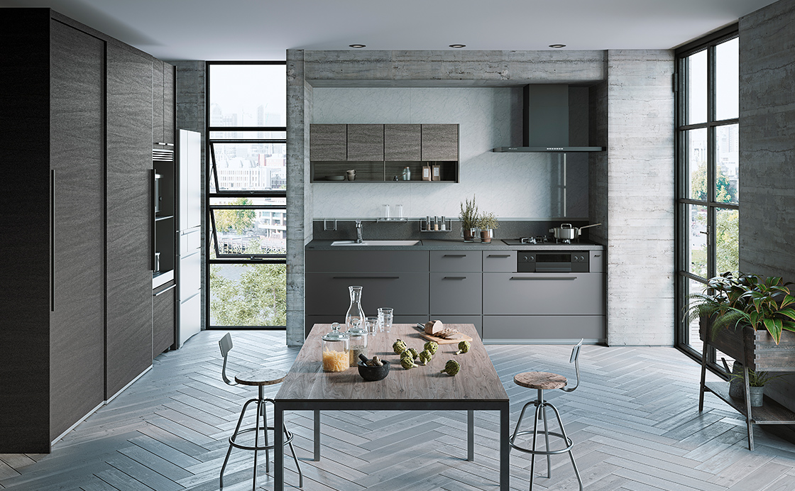 木質ボードを基材とし、テノールカウンターと同様の質感を表現したキッチン扉。表情も、色合いも、手触りの心地いい微細な凹凸の風合いもカウンターと揃って、統一感のある上質な印象に仕上がります。
