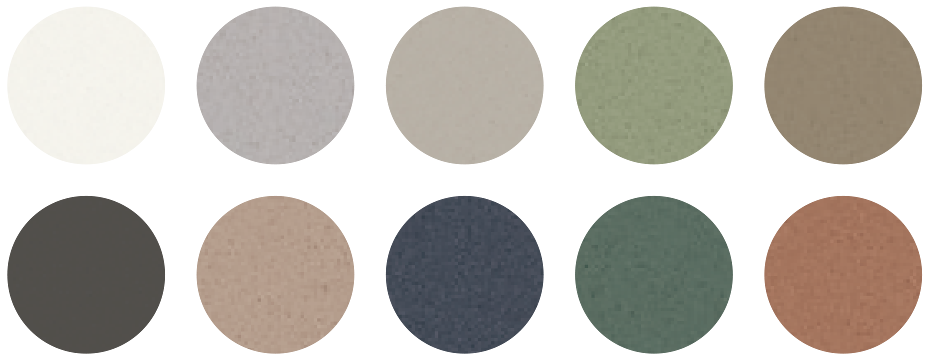 人造大理石粉末「リサイクルフリット」を配合した塗料を吹きつけ、質感豊かに仕上げました。「リュッケファーブ」とは、デンマーク語で「幸せな色」の意味。甘さを抑えたグレイッシュな「くすみカラー」が、くつろぎの空間を彩ります。