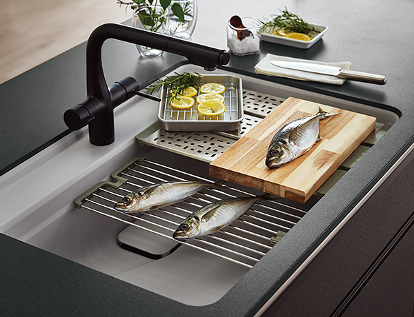 料理をもっと楽しむために、シンク上で調理作業ができるシンクです。