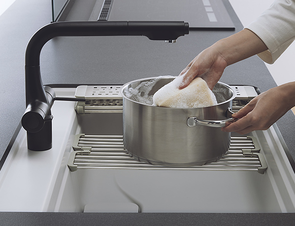 吐水口の位置が高く、フライパンやお鍋など大きな調理器具もラクに取り回すことができます。 -