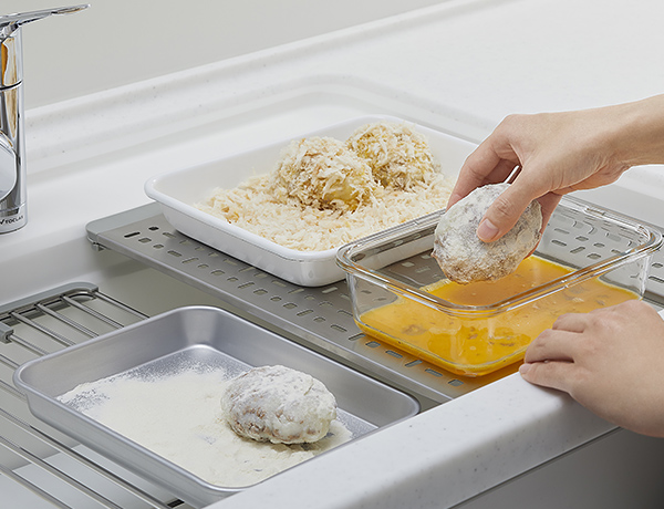 粉が飛び散り周囲を汚しがちなメニューも、シンクの上で調理すれば、サッと水が流せて後片付けが簡単です。 -