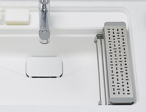 シンク内の上段にセットするフォールディングプレートは、ほどよい間隔の水切り穴付きで材料のカットや水切りに大活躍。 -