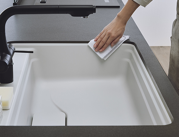 シンク奥・まわりの水はねや、洗剤ダレ、汚れもサッとひと拭き。 -