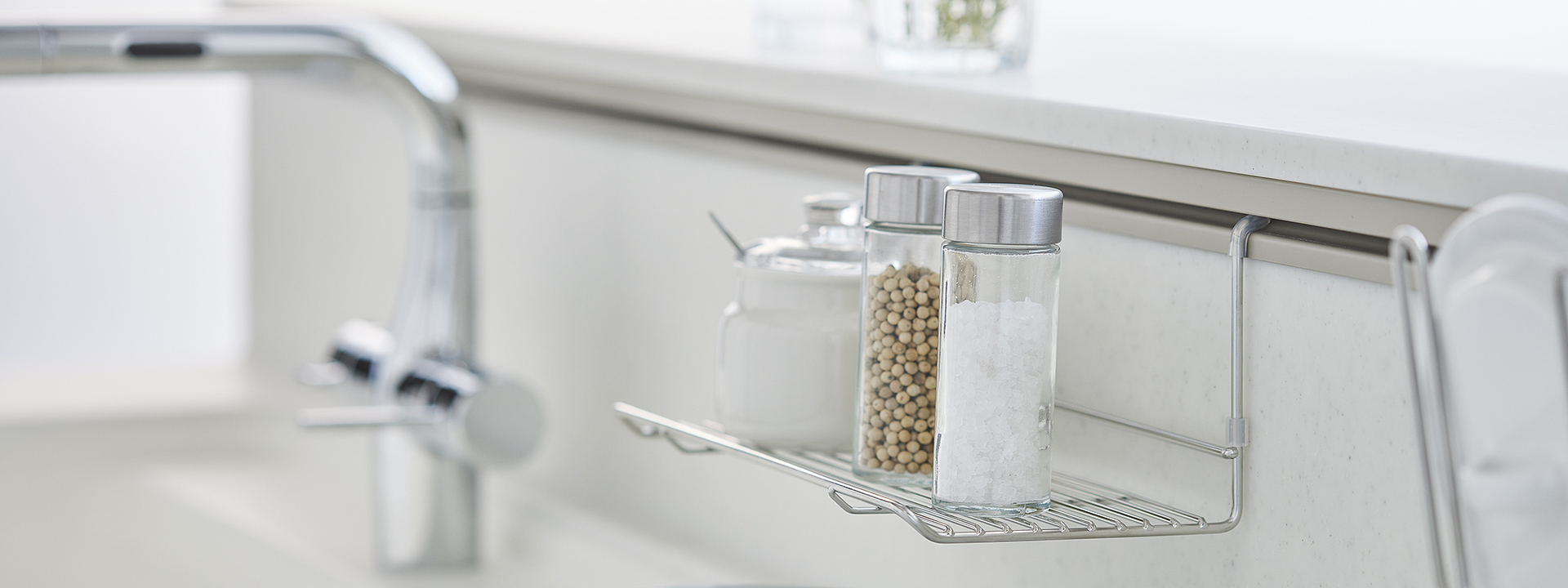 ハンガーアイテムで浮かせて納めるから、カウンターの奥までいつも広々。 -