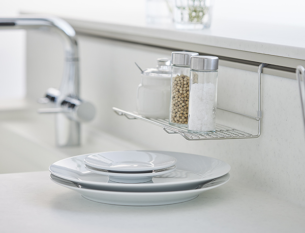 標準装備のハンガーアイテムで、キッチングッズを浮かせ置きできるので、お手入れ・調理がスムーズ。