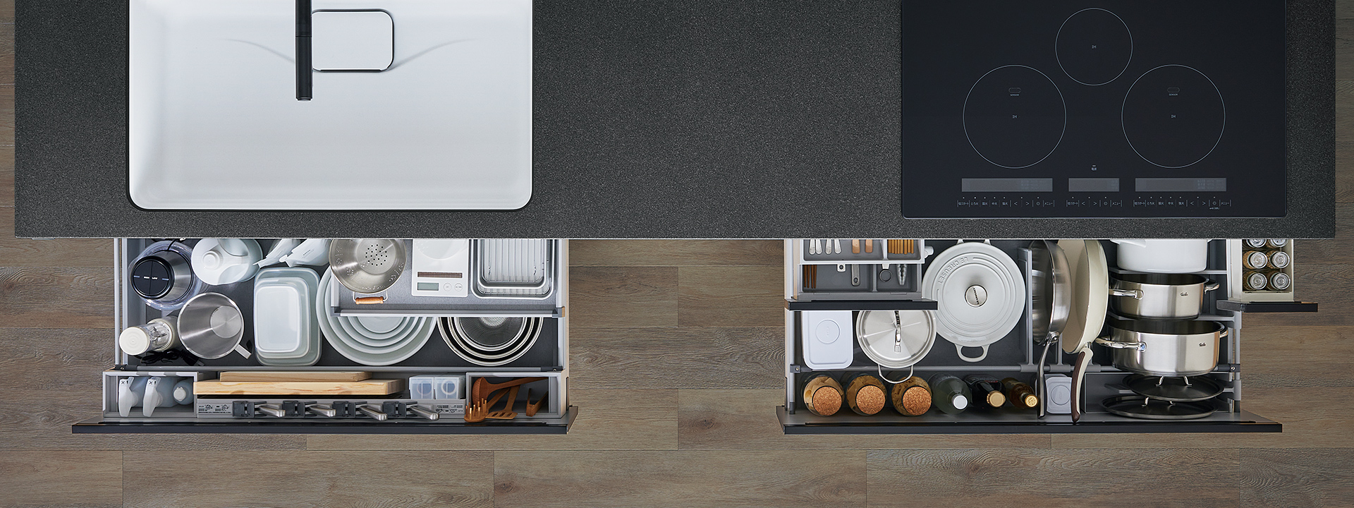 【シンク下スペース】連動イン引出し「ステップドロワー」で、使用頻度や高さの違いに応じてゾーンを分けて収納できます。 -