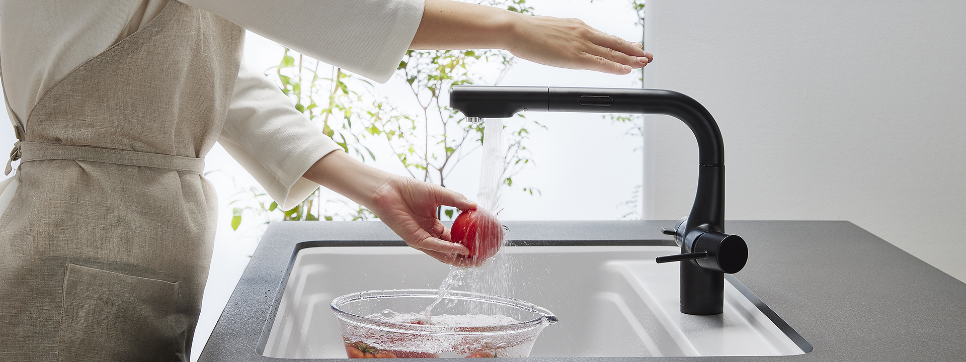 手をセンサーにかざして簡単に出し止め。洗剤や食材の付いた手でも、触れる必要がないので清潔です。 -