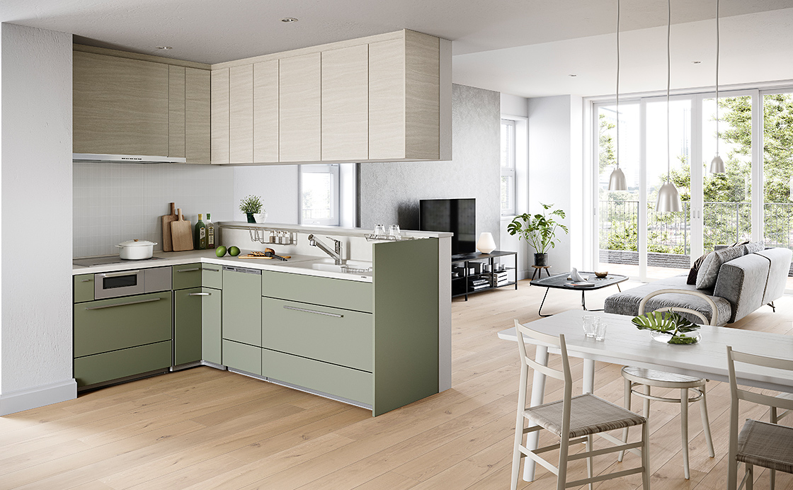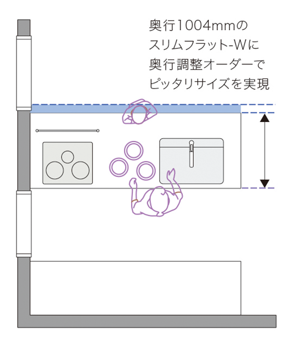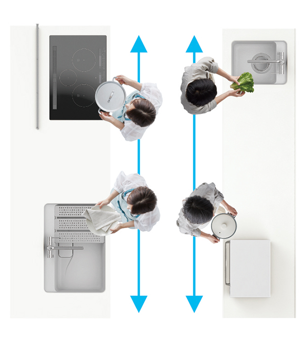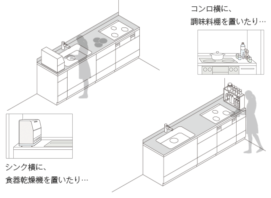 シンクやコンロ位置を左右方向に動かすことで水まわり・火まわりのスペースを使いやすくカスタマイズ。 -