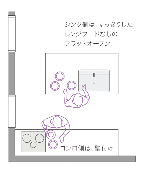 コンロは壁付け、シンクはオープンスタイル -