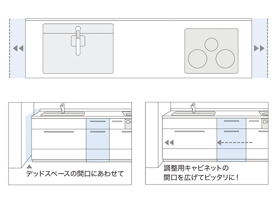 カウンター間口は、1ミリ単位で、調整用ベースキャビネットは、間口を10mm単位で調整できます。(フリーカウンター対応)