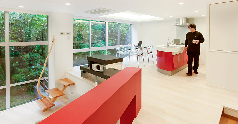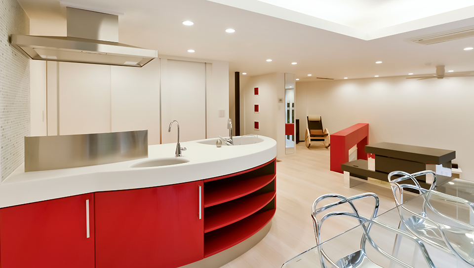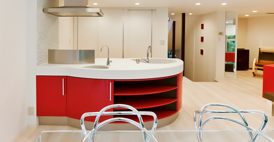 K様邸のLDKの主役は、「紅」色のDOLCE X。「リゾート地ならではの非日常感を演出するため、デザインに特徴のあるキッチンDOLCE Xを最初のプランから取り入れていました」と設計を担当したノイエピナコテークは語ります。奥様が当初選んでいた色は「深紅(こきくれない)」という落ち着いた赤でしたが、非日常感も強調する現在のビビッドな色をおすすめしたそう。キッチンの紅が呼応するように、ガラスブロックや手すりを兼ねたカウンターテーブルにも紅色を取り入れて、空間にまとまりを出しています。