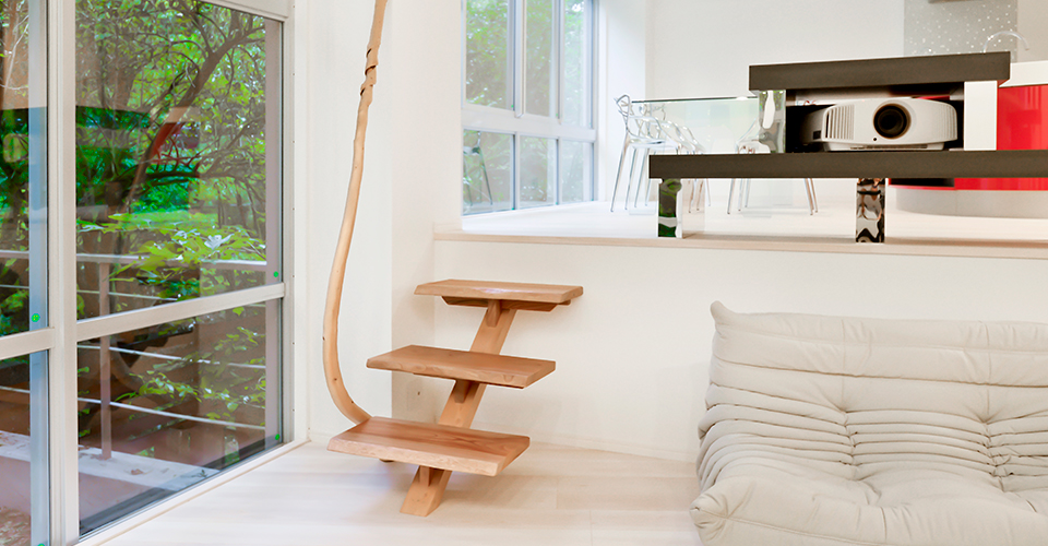 「自然に囲まれた環境にマッチするよう、自然素材を取り入れることにもこだわりました」と設計担当のノイエピナコテーク。リビングからダイニングへのステップにはケヤキの無垢板を採用し、手すりは形にこだわって選んだヒノキの変木に。シンプルモダンに仕上げた空間で存在感を発揮しています。「ユニークな取り合わせが箱根という土地にぴったりですね」とご主人。