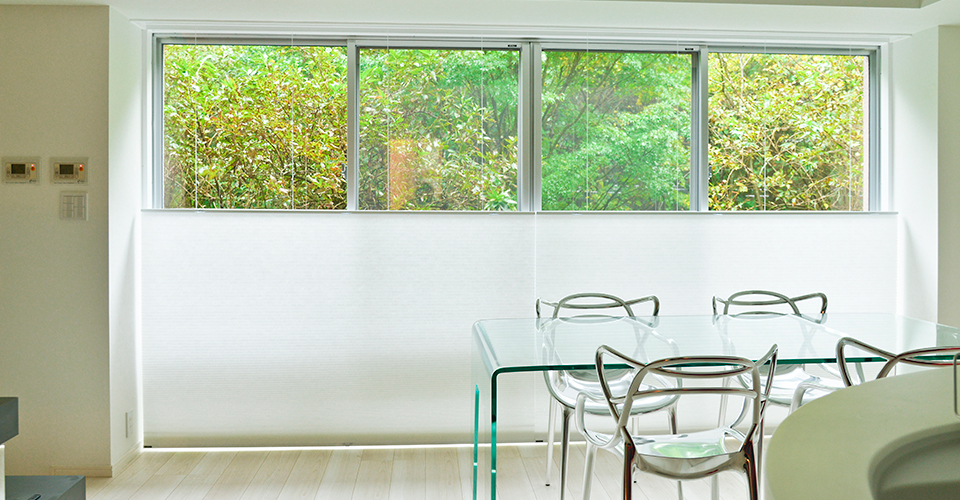 ダイニングの家具は、紅(くれない)をテーマにもうひとつのテーマである“映(うつる)”を意識して、ガラステーブルとメタルチェアを選びました。上部採光ができるハニカムスクリーンは、ロケーションの変化をつけるべく、上部は自然の景色を取り入れたり、全部をあけたりすることができる優れもの。氷点下になる箱根の寒さ対策として、窓ガラスはすべてアルゴンガス入りのペアガラスに。