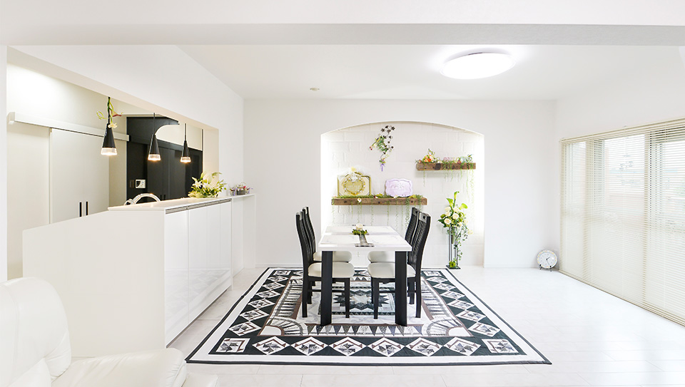 LDKはリビング、ダイニングキッチン、和室に分かれていた以前の仕切りを取り払い、開放的なワンルームに。白と黒でまとめられたダイニングスペースで目を引くのは、正面のアールの下がり壁。「せっかくのリフォームだから、他にはないおしゃれな住まいにしたい」というK様夫妻の思いを受け、トルコ中部の世界遺産の地、「カッパドキア」の洞窟ホテルをイメージして造作しました。