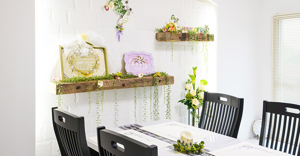 壁には古材を利用したシェルフを取りつけ、奥様のトールペイント作品などをディスプレイ。間接照明がレンガ風のパネルの質感を浮かび上がらせ、雰囲気を高めています。すっきりとした空間の中で、遊び心ある華やかなコーナーが引き立ちます。