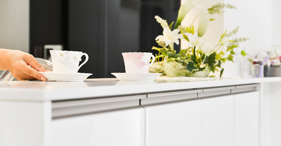 ハイバックカウンターは作業中の手元が見えず、ダイニング側からの見た目がすっきり。また、カウンターに食器を一時置きでき、配膳が楽になったそう。キッチンのワークトップと同じ人造大理石の台なので、汚れても掃除しやすいのがメリット。