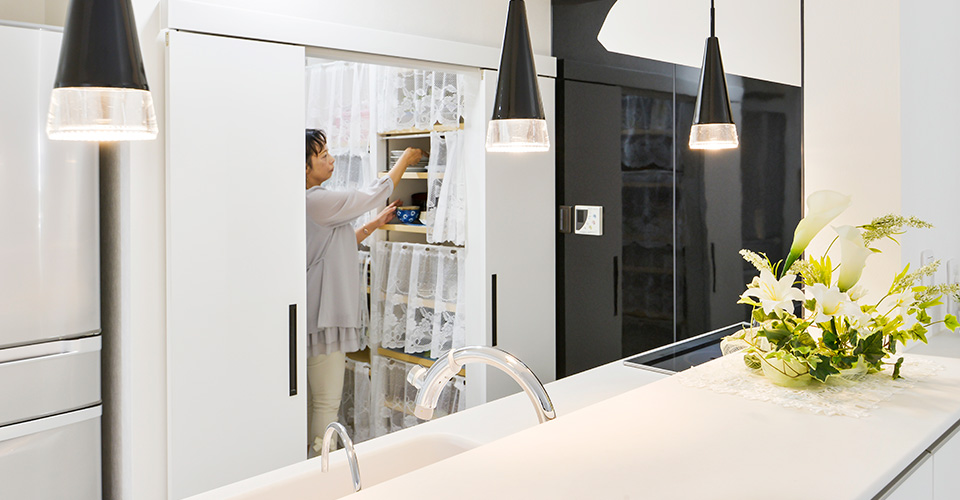 食器や食品ストック、調理家電などは、キッチン背面に設けたパントリーに収納。「パントリーがあるおかげで吊り戸棚がなくても収納は十分。対面式のキッチンがより開放的に感じられます」。内部の棚板はしまうものに合わせて自由に位置を調節できて便利に。