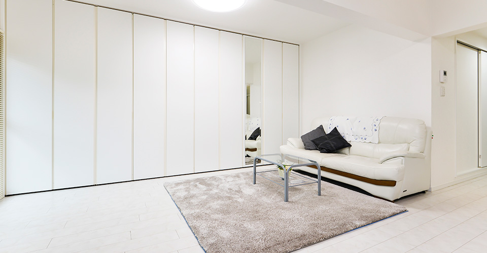 収納の扉は間仕切り用の建具を活用し、天井の高さに合わせて天地ぴったりのサイズをオーダー。扉を閉めれば整然とした印象のリビングに。クローゼット部分の扉の1枚を利用した姿見鏡は、身支度に便利なうえ、空間に一層の広がりを感じさせる効果も。