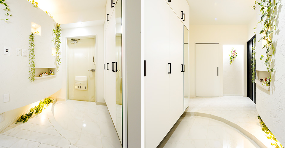 珪藻土仕上げのアールの壁は、ニッチや間接照明が一層の“洞窟感”をもたらします。集合住宅の一室とは思えない、広々とした高級感のあるエントランスになりました。