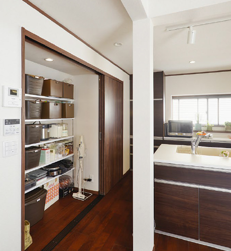 キッチンカウンターの近くに、多種多様な調理器具をたっぷり収納できます。