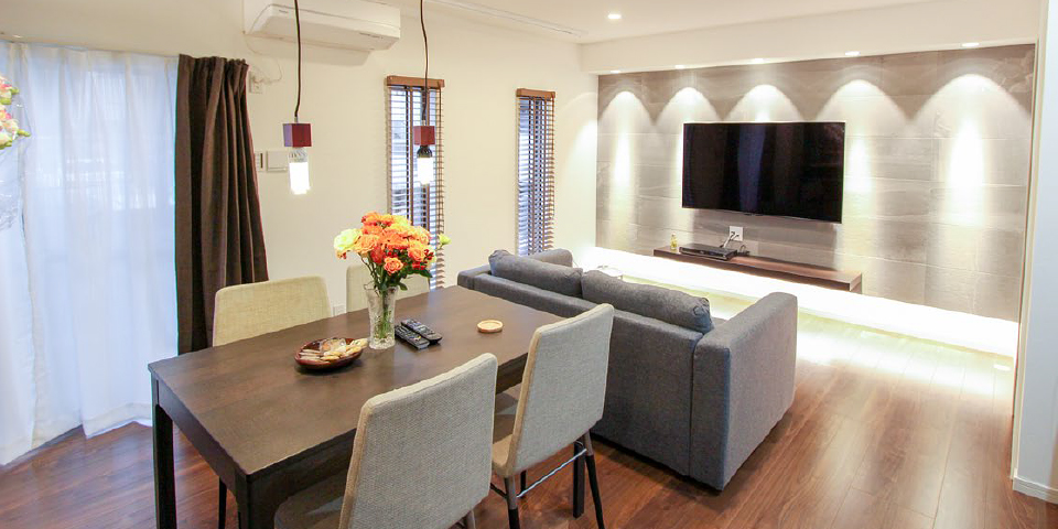 LDK空間には、夫婦で楽しめる60インチTVの映画鑑賞スペースもできました。