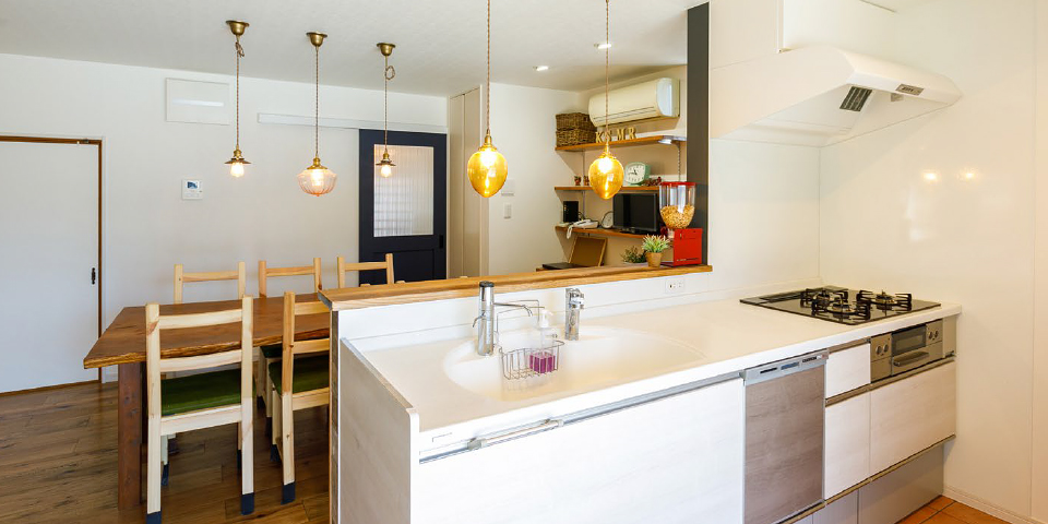 リビングとダイニングのあいだの壁をなくすことで一体感が出て、過ごしやすい空間になりました。照明もあえて電球色の黄色い照明にしましたが、アンティーク家具を置いた部屋の雰囲気に合っていて、とても落ち着きます。私の身長に合わせて天板の高さを変えられるトクラスキッチンのお陰で、調理しやすく、腰への負担もなくなりました。シンクも広く、天板のお手入れも布巾で拭くだけ。換気扇の掃除も楽々で気に入っています。キッチンのタイル床は、油や水分がこぼれても掃除しやすいし、物を落としてしまってもタイルが割れることもなくすごく丈夫です。床暖房も入り、本当に快適になりました。