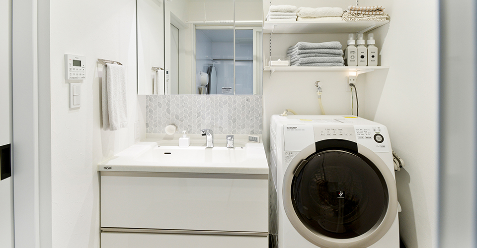 洗面室は白で統一したホテルライクなインテリアに。洗面化粧台は小型犬をシャンプーできる「AFFETTO」のマルチユースボウル・ペットプランを採用。「実は近々ペットに犬を迎える予定なんです」とS様ご夫婦。その明るい表情から、新たな住まいでの暮らしの満足度がうかがえます。