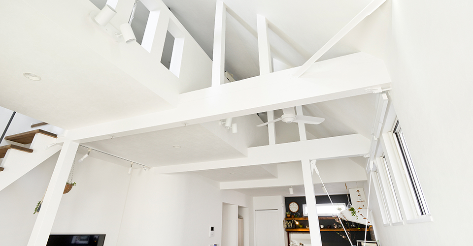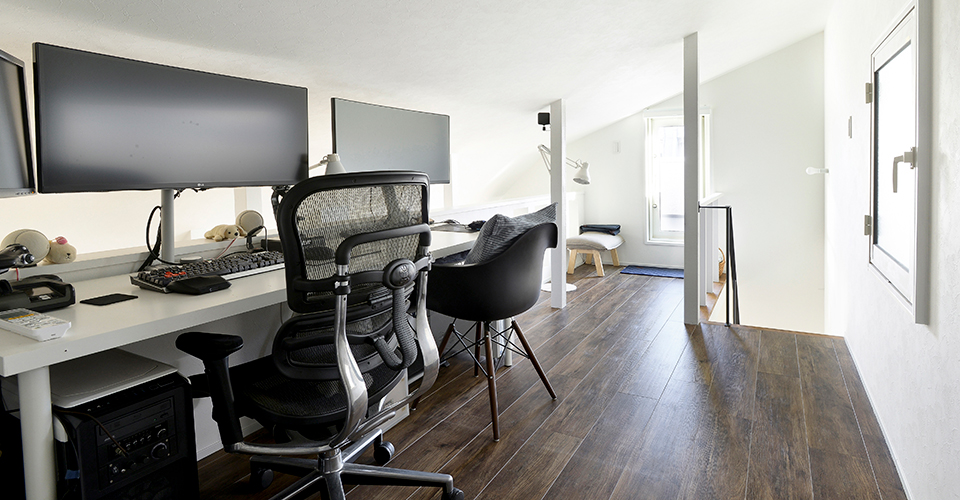 ロフトはご夫妻の書斎&趣味のスペース。ロフトとリビングは吹き抜けでつながっているため、「声が届きやすく、お互いの気配を感じられるのもいいですね」とS様。断熱性を高めているため、夏でも暑さを感じないそうです。