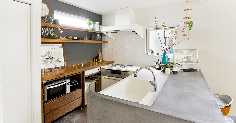 アクセントクロスを貼った壁に、雑貨やグリーンが並ぶディスプレイ棚。そんな素敵なキッチン空間の主役を飾るのは、「Berry」のL型プランです。「人造大理石の白い天板が大のお気に入りです。壁や収納とのコントラストもきれいで、収納量が豊富な点もポイント」というS様。笠木カウンターはモールテックスでスタイリッシュに仕上げています。